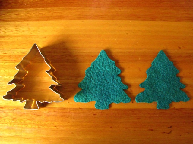 I used our Christmas tree biscuit cutter and drew around it to make my template. I cut out my two little trees in felt.